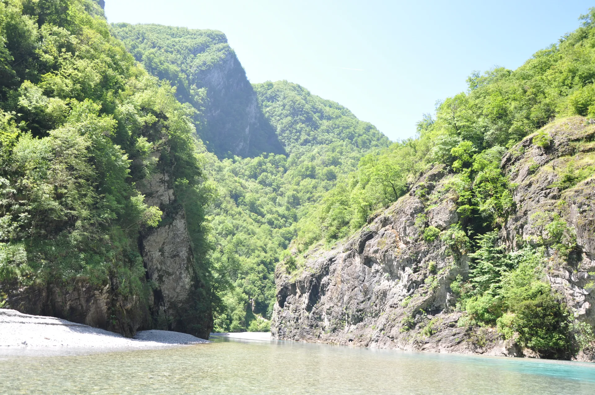 Tranquil turquoise waters of the Shala River flanked by sunlit green canyon walls.